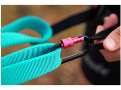 De karabijn doet u aan het tuig van de hond en het handvat kunt u vasthouden of bij het gebruik van een heupgordel met een karabijn vastmaken, of door hem met het handvat door de ring te doen en er een lus van te maken.