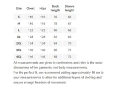 Voor een perfecte pasvorm adviseren wij om ongeveer 5 cm aan uw lichaamsmaten toe te voegen, zodat u voldoende ruimte heeft voor laagjes en bewegingsvrijheid.