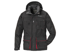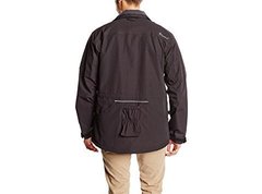 Op de voorkant zitten 2 grote zakken met drukknopen, deze zakken hebben beide aan de voorkant ook een zak met een rits. 2 Borstzakken met klep en daarboven nog 2 zakken met rits (waterdicht). Met praktische achterzak en waterfleshouder op de rug, afneembare capuchon met verstevigde rand. De jas is gevoerd met hoge ventilate net/gaas voor extra comfort. De jas heeft 3 D-ringen en een houder voor een fluitje.